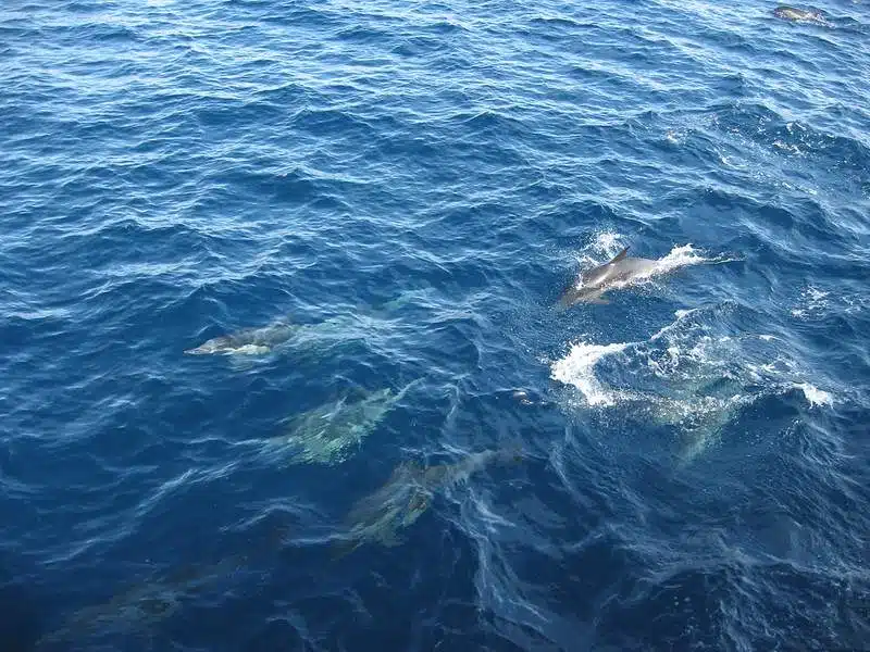 Bottlenose dolphins appear in smaller groups, recognizable by their larger size and lack of spinning behavior. Risso’s dolphins occasionally appear but remain much rarer than their smaller cousins.